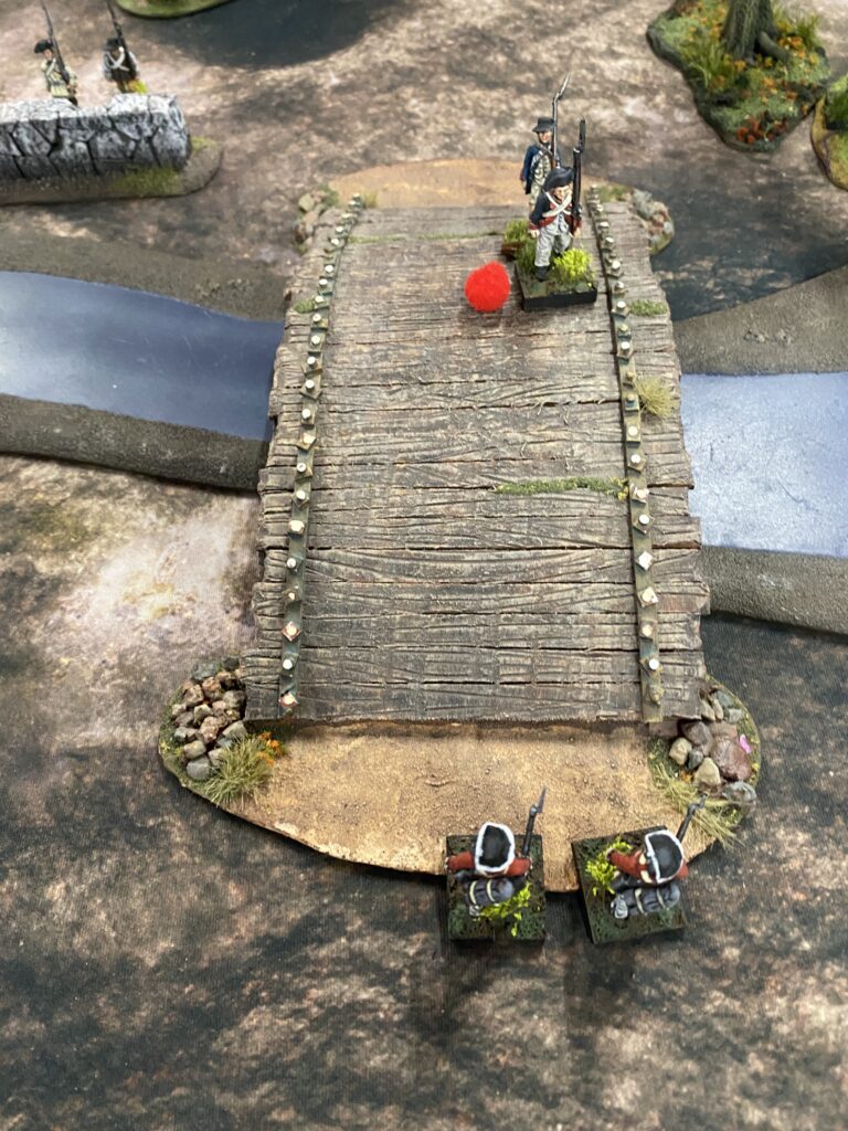 Andrew had stymied the Red Coats advance on the bridge with his accurate musketry as we see two infantry with red markers indicating that they are downed.