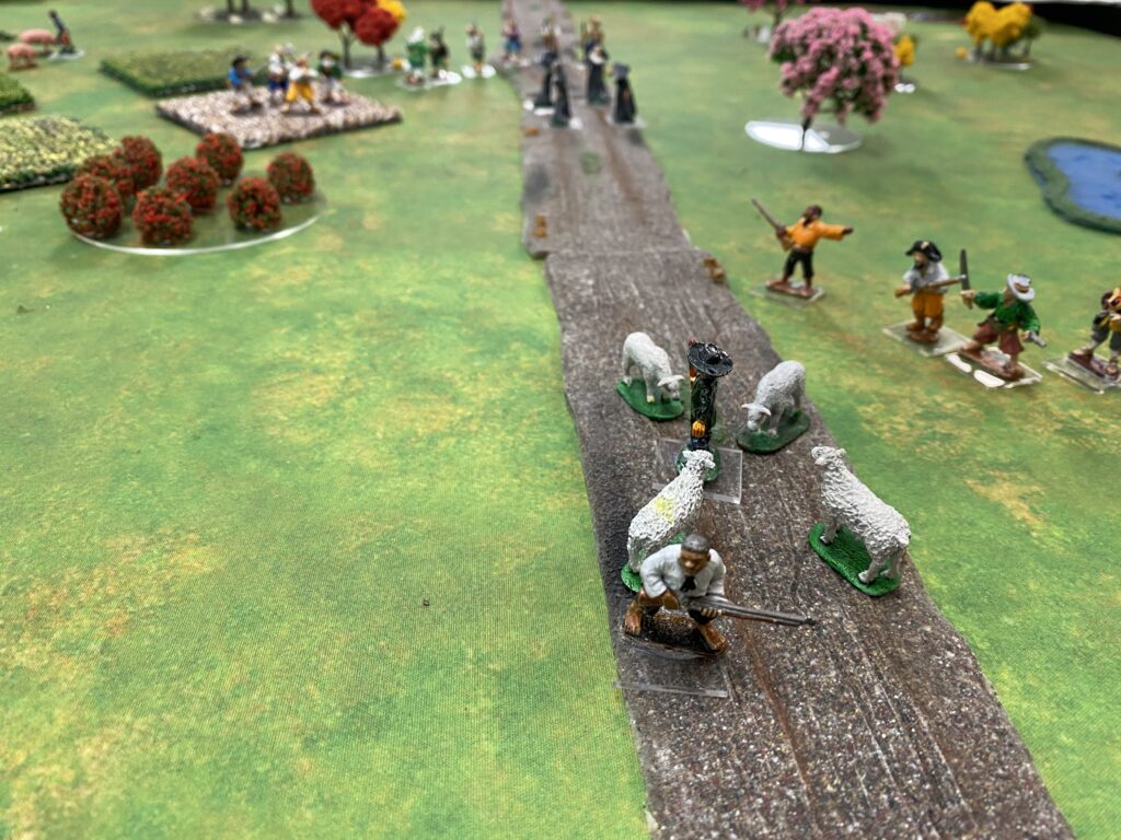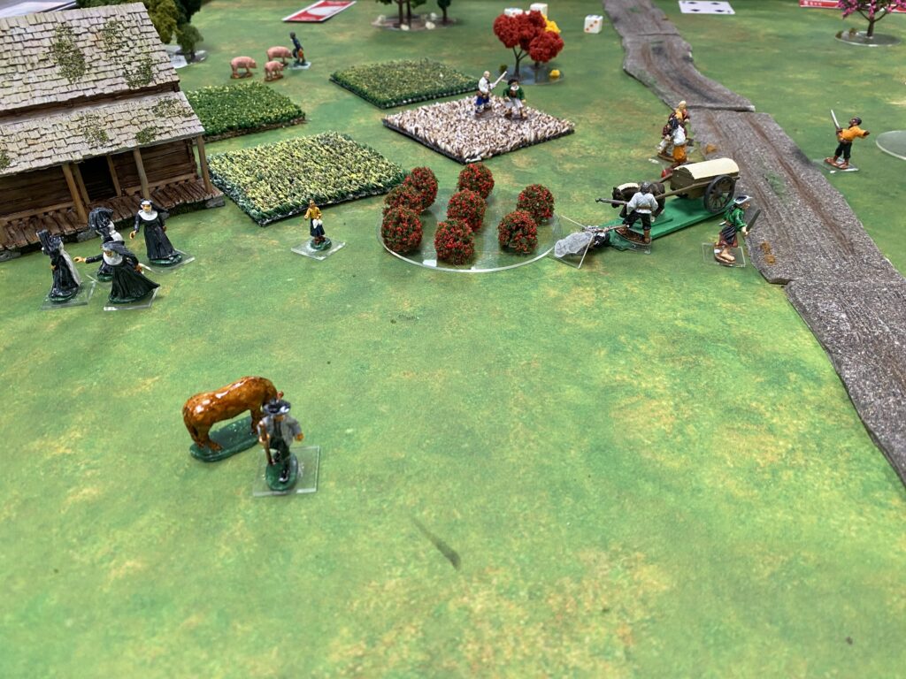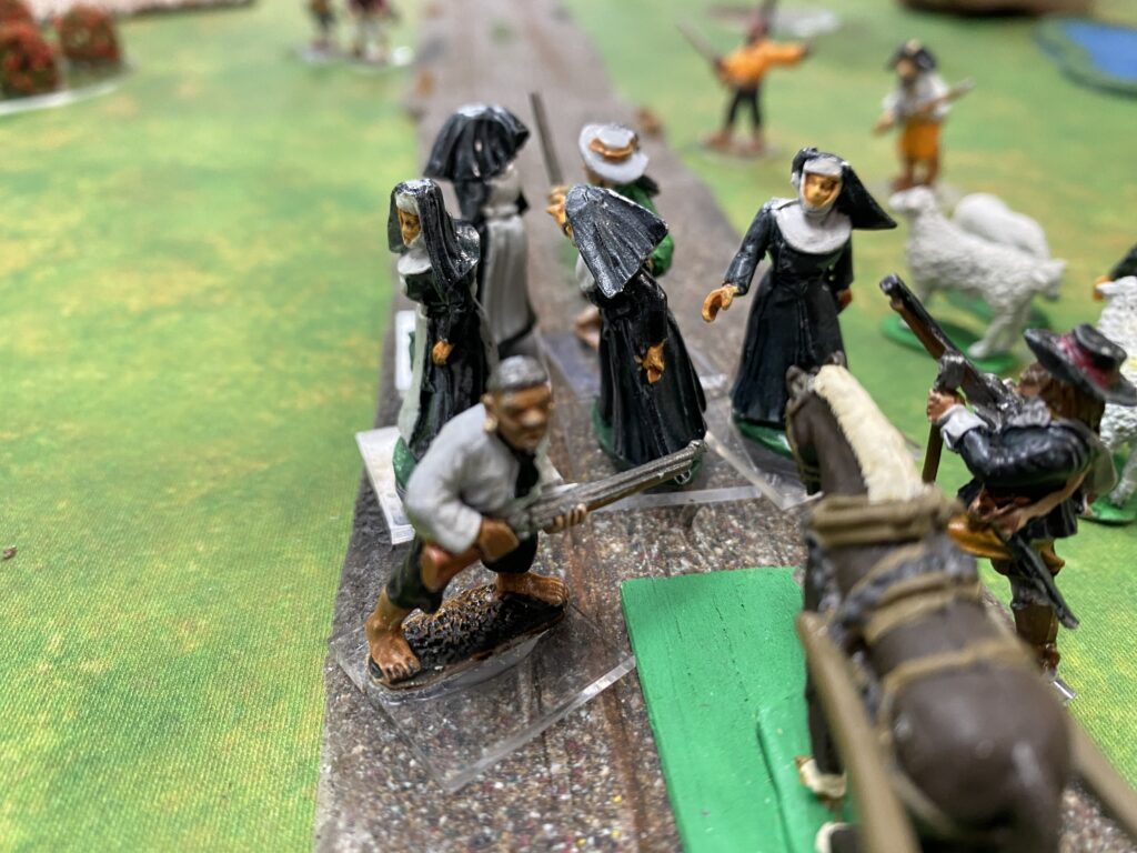 Jules had requested the Sisters move oof the road towards the farmhouse. It was noted during the game that those who were nicer to the Sister’s seemed to get better die rolls. The Wagon now devoid of militia is under the control of a highwayman group and headed for their lair.