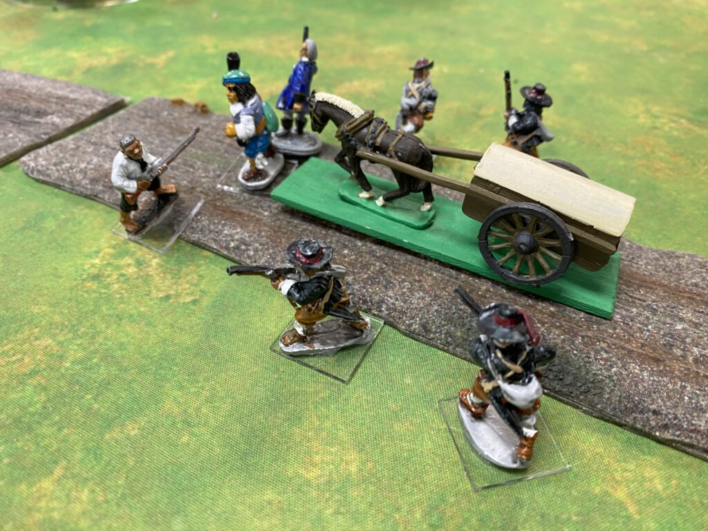 Our Semi Regular Retirees Game was held at Miniature Market Rock Hill for some rockin’ action with the swashbuckling rules.… And One For All! In this scenario we find the King’s Tax Collector with a heavily laden wagon was leaving the village of St. Francois under escort of the local militia.