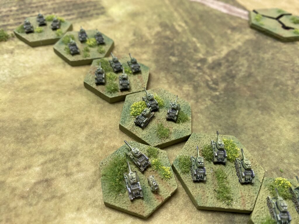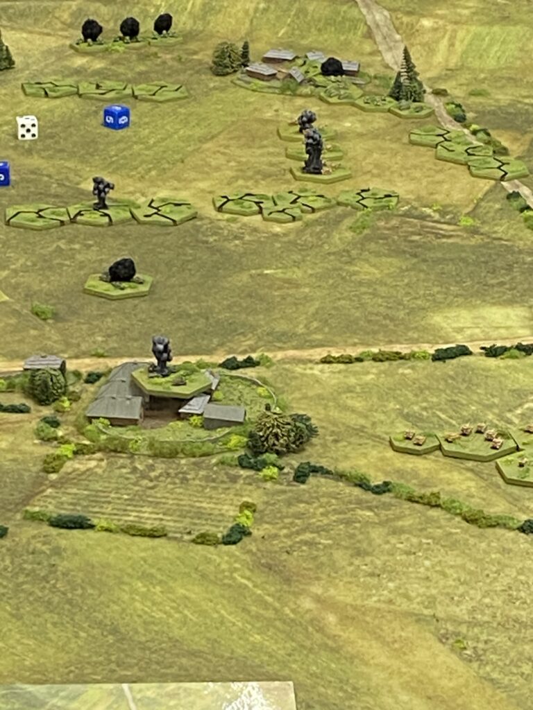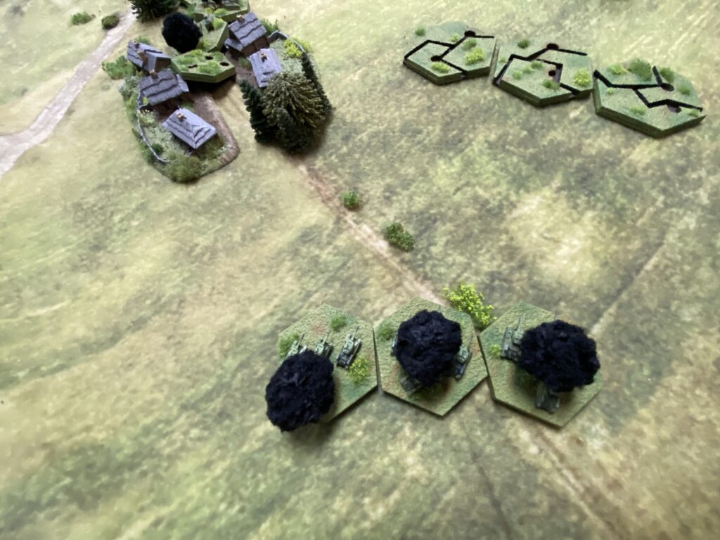 “The scenario pitted a Soviet Medium Tank Brigade with a leading Recon element, against a German Infantry Bn. dug-in, and reinforced with a PanzerJager company (backed up off-board by a PzIV tank company). The Soviets began their attack with a proper and successful reconnaissance probe, that triggered some German responses, but importantly revealed some potential approach routes towards their crossroad objective.”