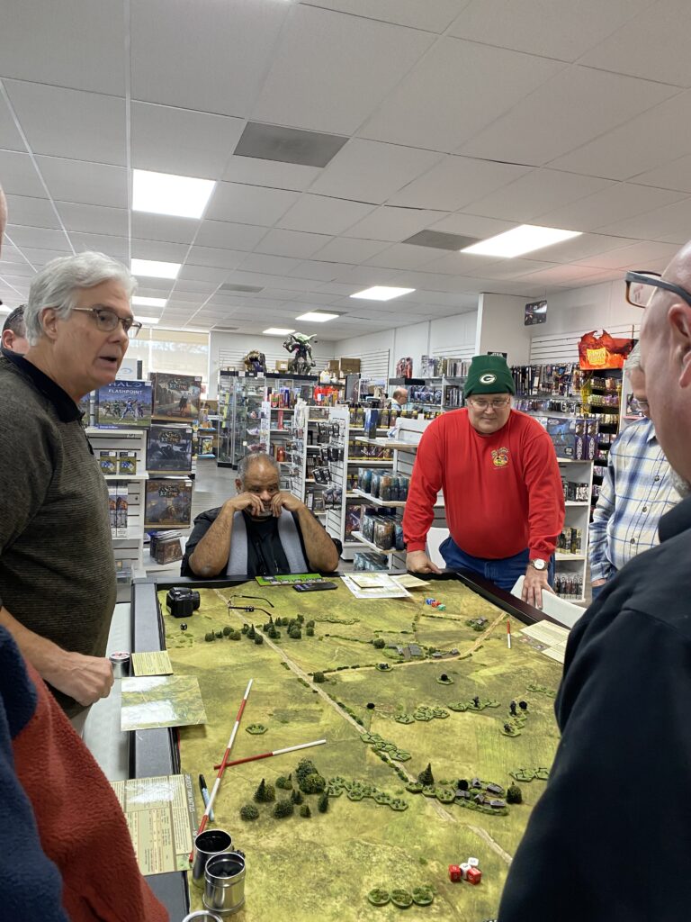 Our third offering our December Game Day West was a visit to the the Eastern Front of WWII presented by Dave Schaffner. As always Dave gave the players a spectacular visual experience along with a tightly run moving puzzle to solve as the sides jockeyed for position with move and counter move trying to outguess each other’s deployment and intentions.