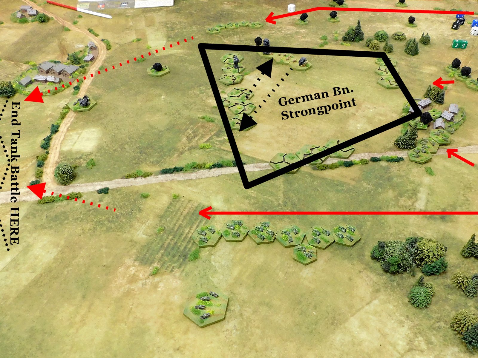 “The main action began with two tank battalions, in company echelon, pushing in the center and on their right – these spearheads hit hard up against the German infantry/AT strongpoints. Mostly placed as a Battalion hedgehog defense in the middle of the battlefield, this solid German position denied the Soviets a direct route westward, splitting their attacks into a left and right wing. Within this battle space, there was hard fighting as the Panzerjager SPs dueled it out very successfully with the advancing T-34s commands trying to find open ground to exploit.“