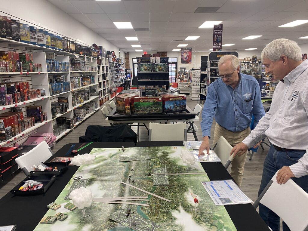 The searchlights were sweeping the skies and the night patrols were running racetrack patrol patterns awaiting a nocturnal visit from the great German Airships. They had come the last several nights and there was no reason to believe this one would be any exception to the rule. The stage was set for our Thursday Semi Regular Retirees Game with Mark Williams hosting a modified Wings of Glory WWI nighttime bombing raid at Miniature Market Retail Superstore Rock Hill.
