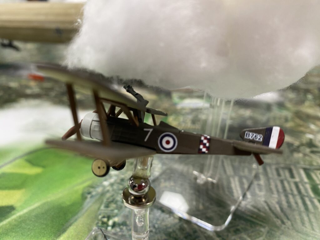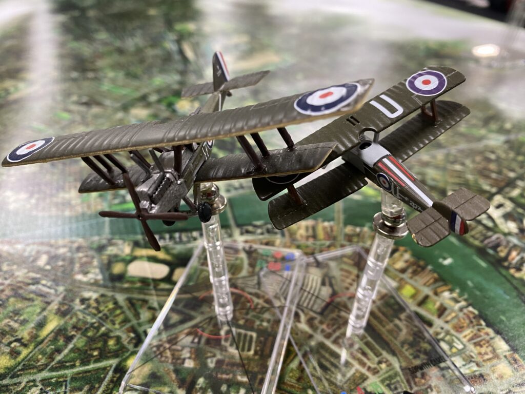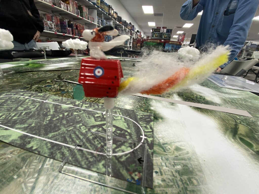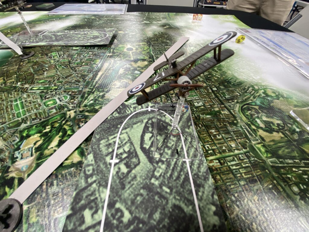 For this game the Famed WWI Flying Ace on leave from the front was called upon to pitch in and help with patrol duties due to a shortage of pilots. He grabbed a nearby Sopwith Camel and took up his post to help defend the city.