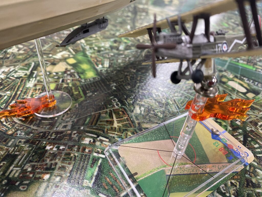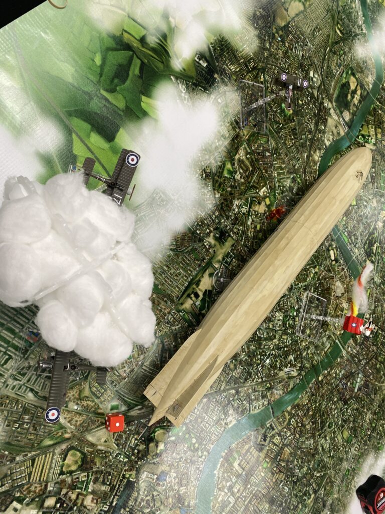 Greg’s two seater got in what proved to be a very fortunate shot setting the Zeppelin fuel tank on fire not only causing some immediate damage but a fire that lingered for several turns racking up hits to the airframe. It wasn’t without cost as the Zeppelin scored a similar hit to Greg in the exchange. Fortunately Greg’s rear gunner was on his game and put the fire out quickly.
