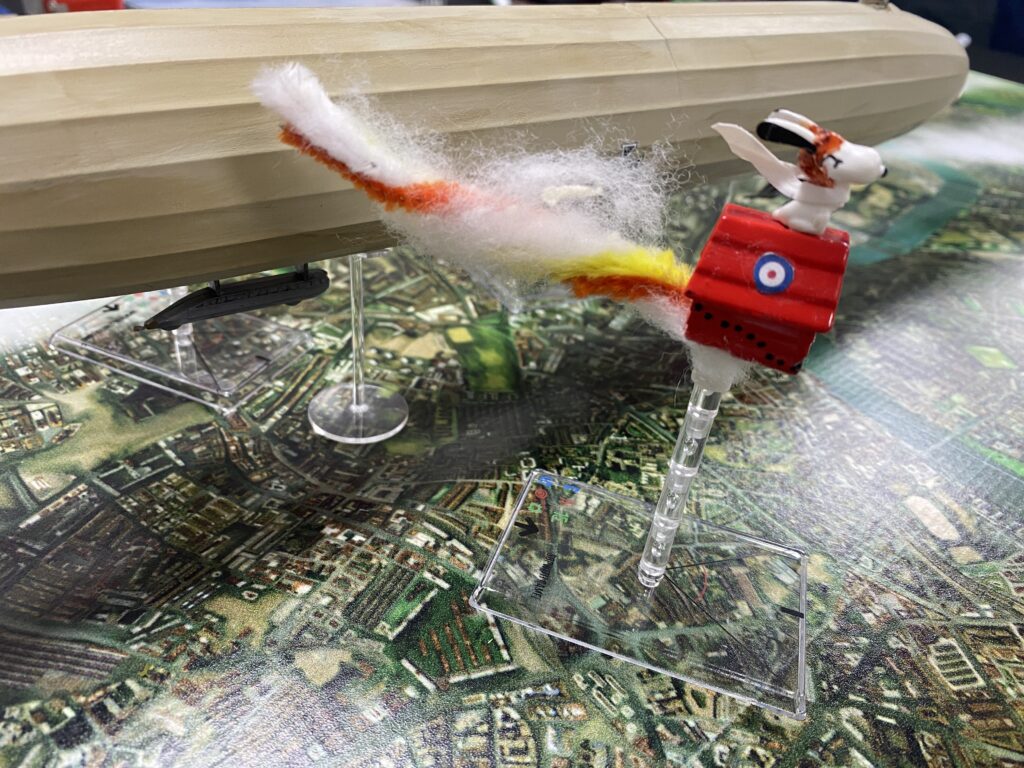 This ended up to be a game with two results. The first was an explosion by the Zeppelin which would send it down in flames as a result of the continued fire from the shot that Greg inflicted. The second which as we all elected to carry on just allowing the fire to continue to burn ended up with the airship delivering it’s cargo to Paddington Station inflcting heavy damage to the rail system and perhaps injuring Paddington Bear.