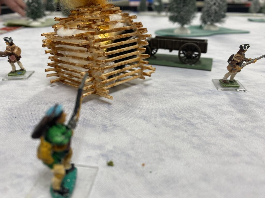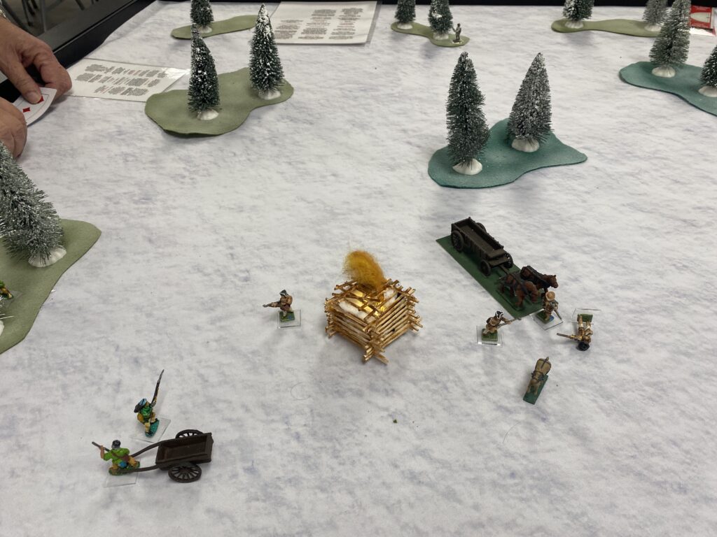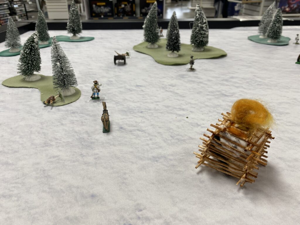 The popping of the green cane in the fire and the heavy snow fall has allowed a large force of Patriots (Pete P and Nate R) to all but surround the Loyalist position.