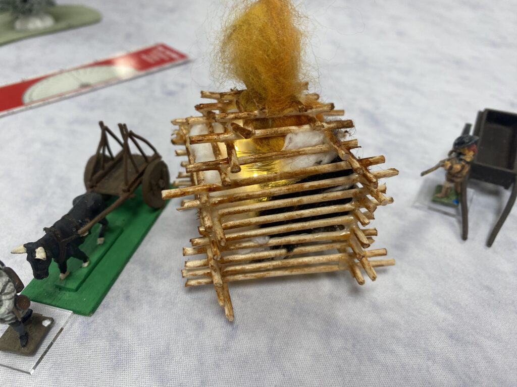 The Loyalists (Mark J) had intercepted some supplies destined to curry favor with the Cherokee tribe sent by the Patriots and were holding up in a break in the heavy foliage (the cane) near the Ready River. Almost a foot of snow had fallen and the ill equipped troops had built great fires of the cane to keep warm.