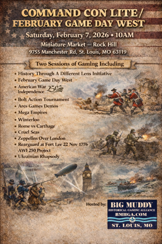 Command Con Lite anchors our February schedule and includes our February Game Day West, featuring two full sessions of gaming, a Bolt Action Tournament, and multiple historical scenarios across different periods.