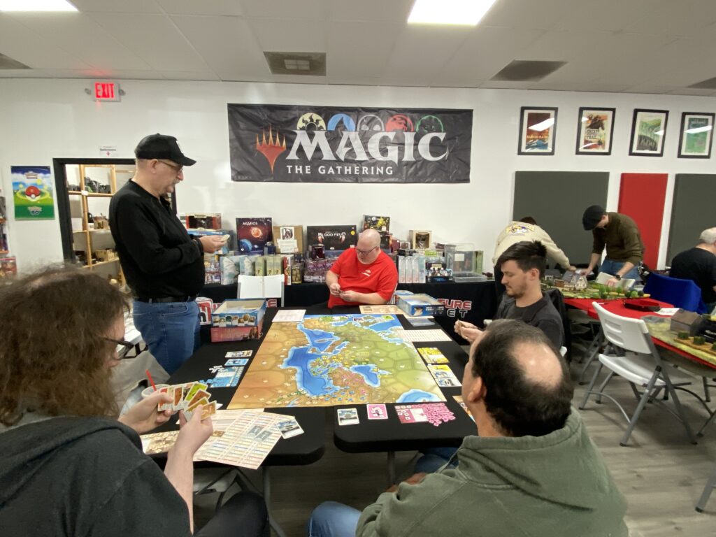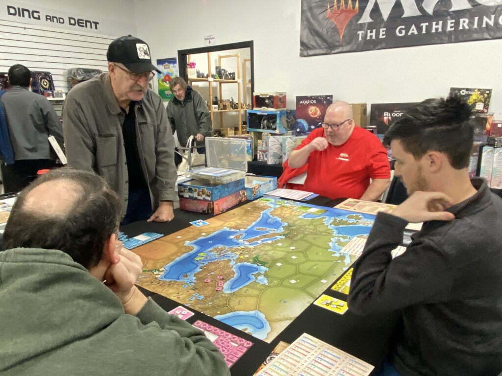 We were especially fortunate to welcome Jim Long, U.S. representative from Ares Games, who joined us to demo their Mega Empires game system. This proved to be very popular, with many players taking advantage of the opportunity to sit down and play directly with the manufacturer’s representative.