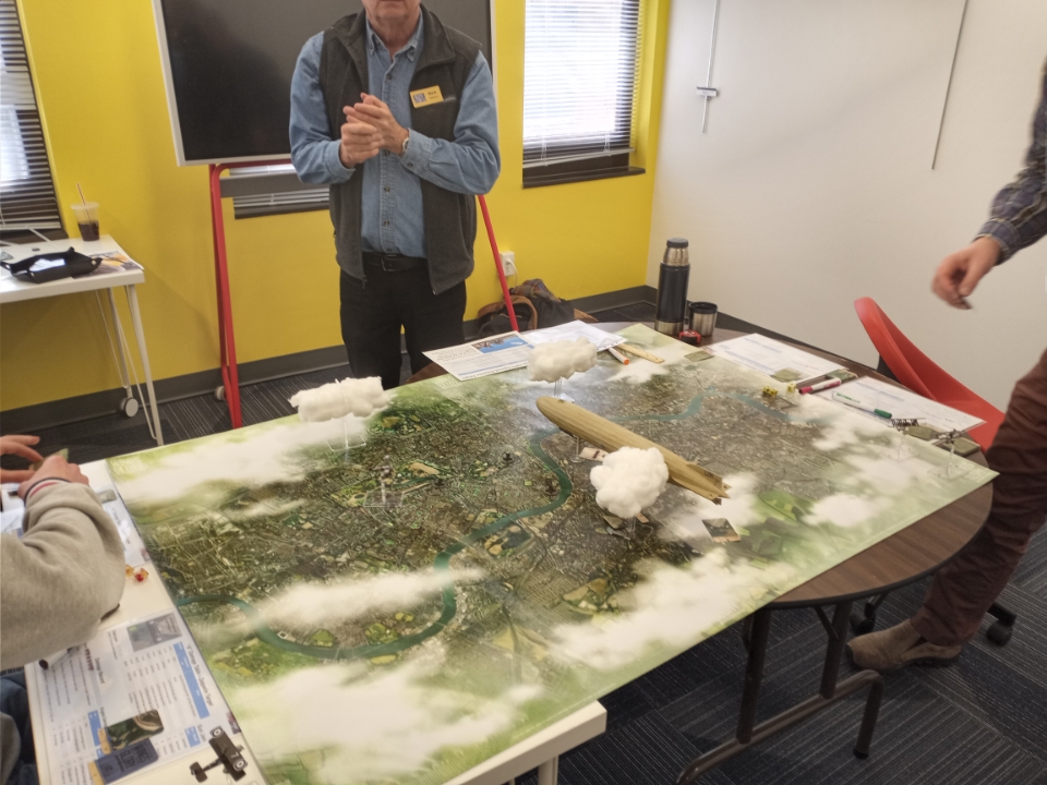First up was Mark Williams offering of Zeppelins Over London during World War I to give the students a look at the industrial era warfare of the 20th century. Using a modified version of Ares Games “Wings of Glory WWI” game system Mark lead the players through a night time terror bombing raid over the British Capitol.