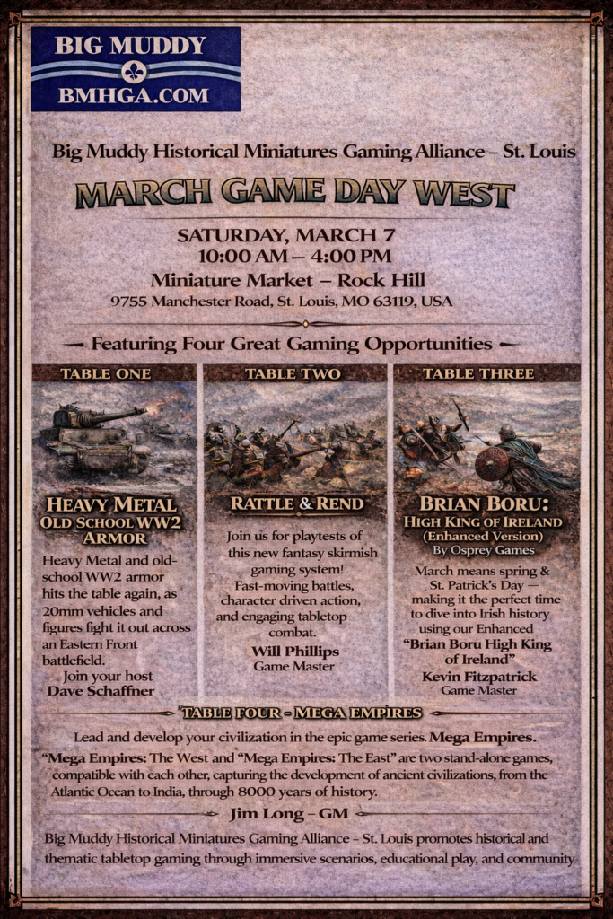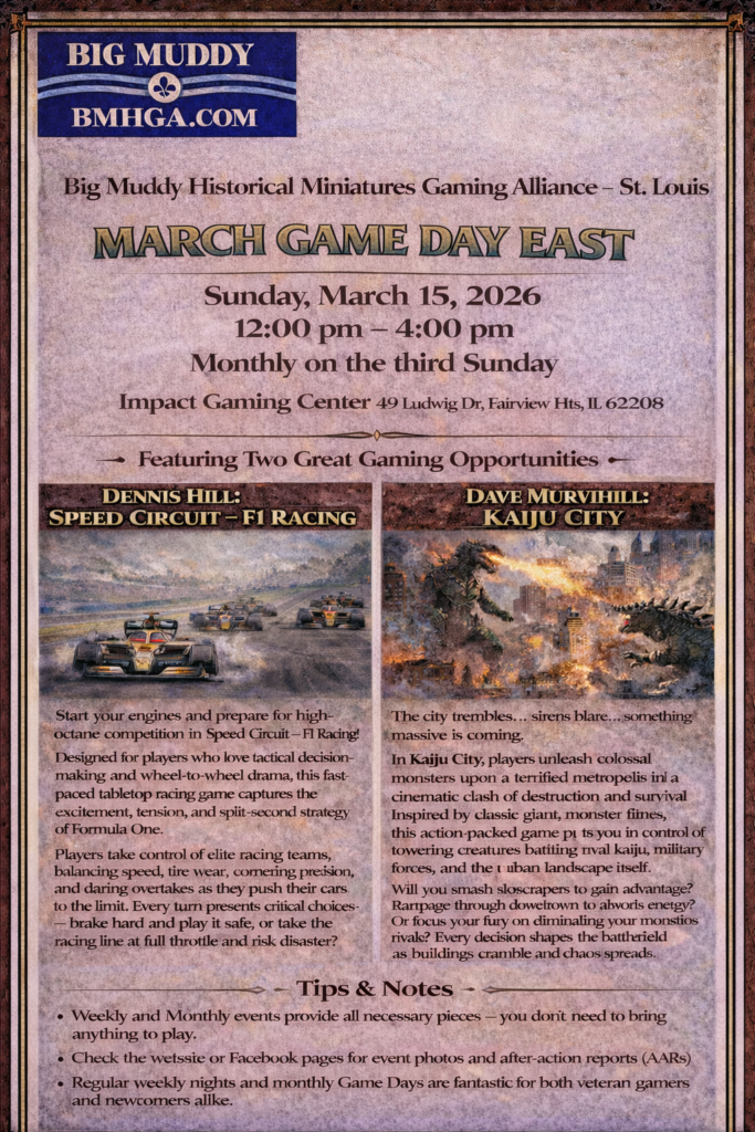 Big Muddy Historical Gaming Alliance – St. Louis (BMHGA) strives to support and build the historical gaming hobby in the St. Louis Metro Area “By demonstration, presentations at conventions, schools. libraries, and other events, where the theme includes military or gaming.