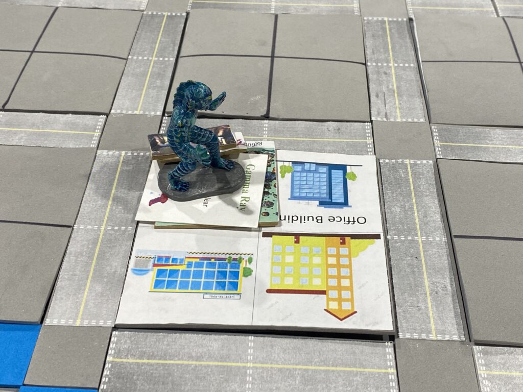 We explored all aspects of the rules as our Monsters and Nemesis took to the neighborhoods causing or trying to stop the destruction of the fair city. Skyscrapers were smashed, crowds fled (sometimes successfully), buildings were destroyed and monsters engaged each other using the unique card planning and draw system which Ray G found out it is important to have the cards in the order planned and not reversed.