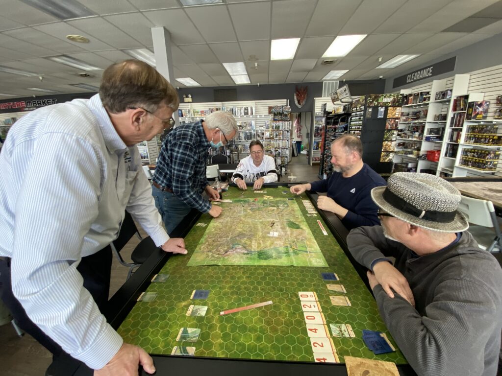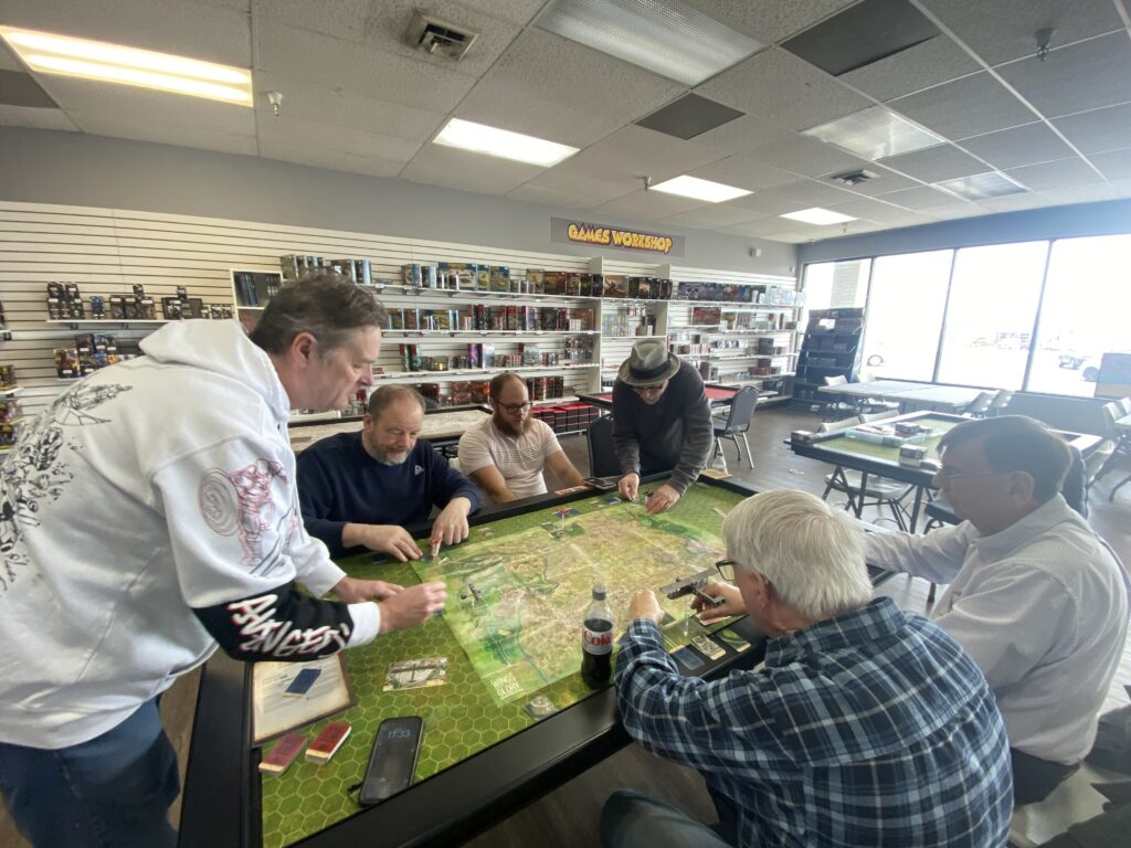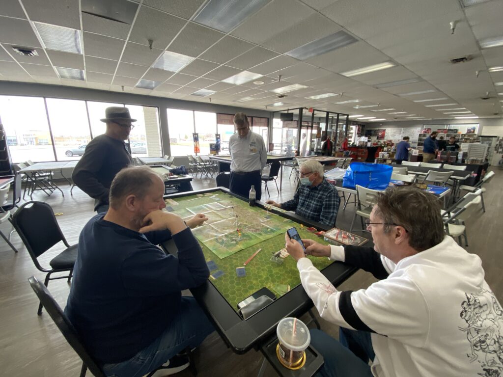 Gathered at their respective aerodromes at Miniature Market Cave Springs our group took to the “not so friendly skies” over No-Man’s Land of World War I using “Wings of Glory” by Ares Games.