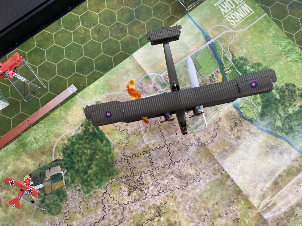 The Handley Page did make it to the target and successfully attacked it, but was caught on the way out with the dreaded “boom” card which finished it off.