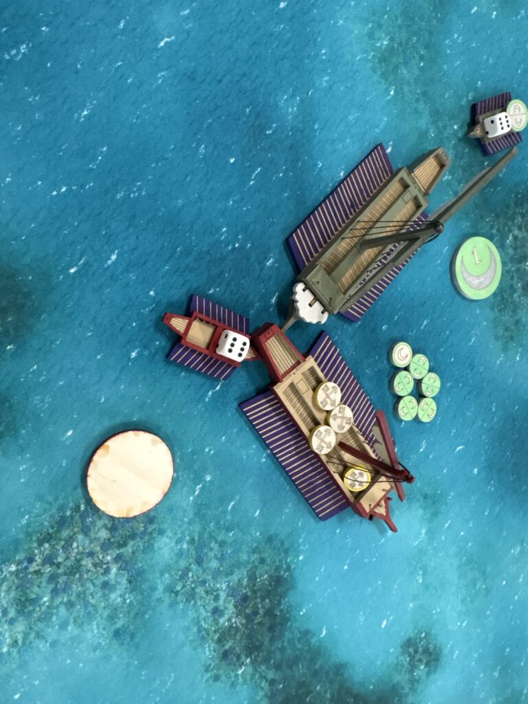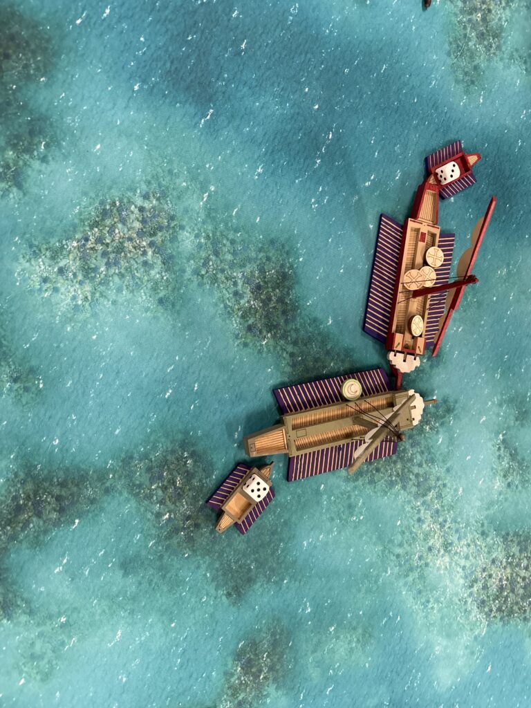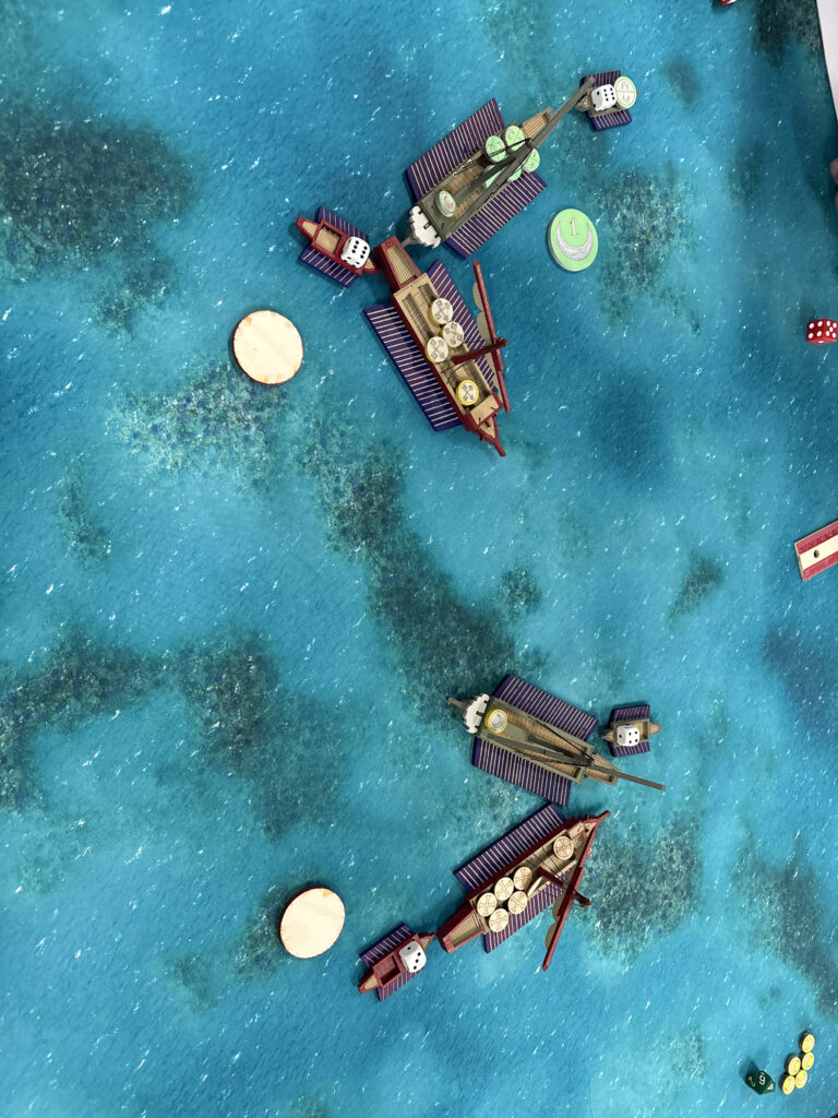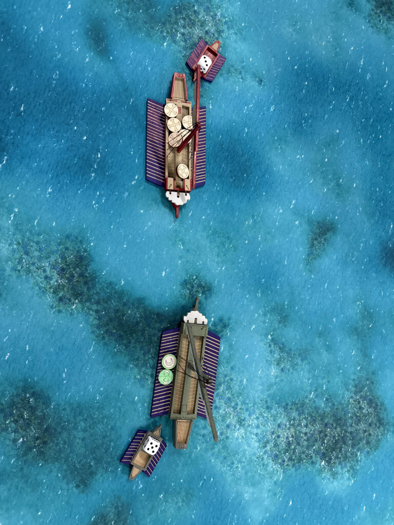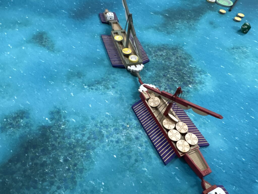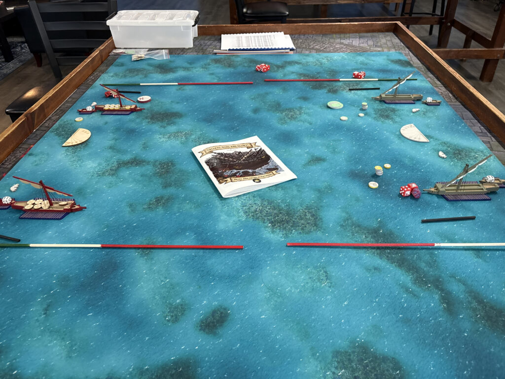 The Tuesday Night Crew at Game Nite put to sea again this week with something new off the shelf with a trip back in time to the age of rowed galleys in the Mediterranean Sea using “Galleys, Guns and Glory” rules for the era.